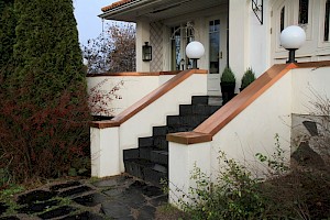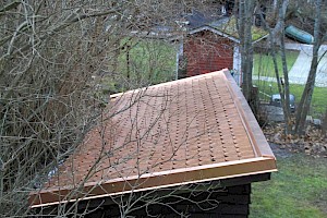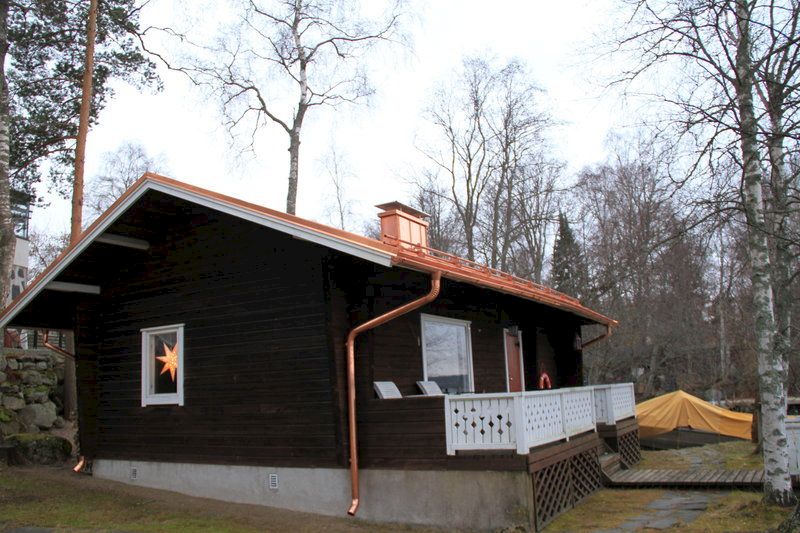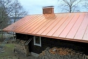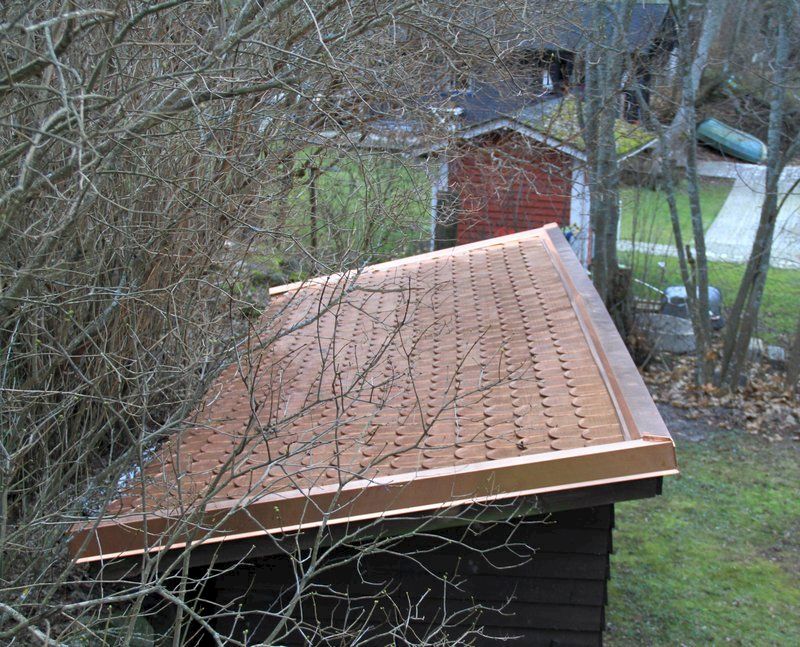 Pyhäjärven rantamaisemissa saunamökin vanhan tiilikaton uusiminen kuparikatoksi. Kohteessa toteutettiin myös puuvajan katto kuparipalahuovalla sekä uusittiin muuripellitykset kuparilla.